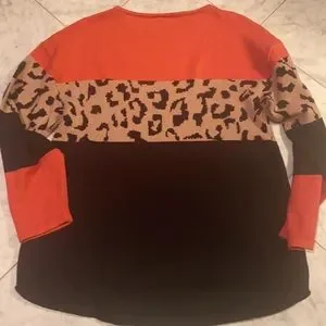 This is a great top, awesome color combinations with an animal print bonus panel. The sweater material is soft and comfortable; never worn. I took off the tags, but when I tried it on, found it’s too big to be a M, which it’s marked. If measures 22” across the mid area, so it’s a L or XL….. my loss is your gain!