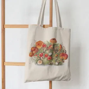 Features a natural light tan color and one side vintage print of orange tone mushrooms.