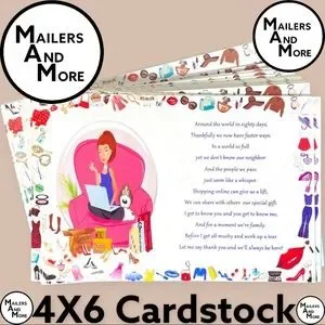 Printed 4X6 cards can be used with your sales. This is a Mailers And More exclusive design!