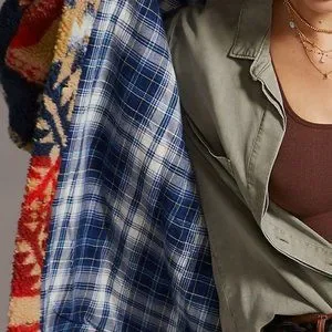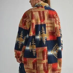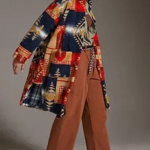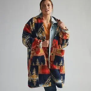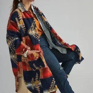 Warm-up this season with the Pilcro Sherpa Duster Jacket! This western bohemian-coat features fuzzy Aztec Sherpa that shapes a collared neckline, drop shoulders, and long sleeves. A longline contour boasts a plaid lining and two side seam pockets. Pairs perfectly with a latte and a chilly day!
