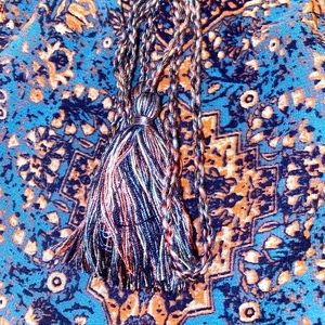 Braided drawstring with fringe tassel detail. Two side front pockets.