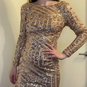 Like new! Great dress for New Years Eve or other semi-formal occasions. Back of dress is fastened by a button at the nape of the neck.