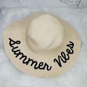 SUMMER VIBES STRAW FLOPPY BEACH HAT SUMMER HEADWEAR SAYINGS FUN ONE SIZE FITTED