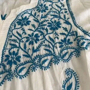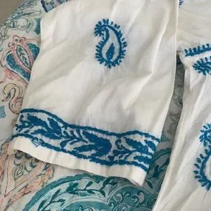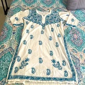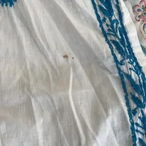 Beautiful blue embroidery detail. Open at the sides but hangs baggy everywhere else. A few small stains but overall in great condition