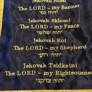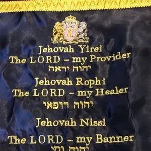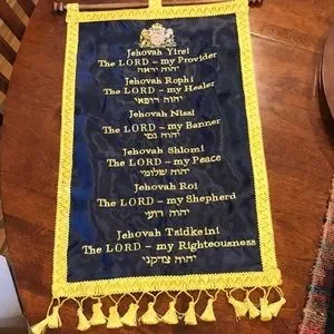 Religious wall hanging, Satin material with gold embroidery thread, tassels on bottom, wood dowel on top