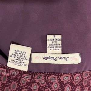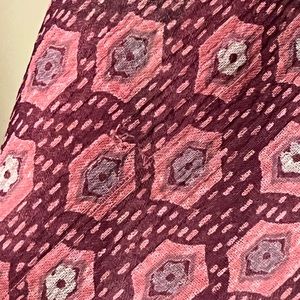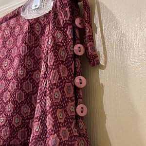 A stylish, kind of dark academia themed skirt from Free People with hexagonal designs all over it. Also features some fancy embellishments with some satin like loops along the center the skirt and the hem, and buttons up the side. A bit sheer and has an opaque slip underneath in a nice purplish color. Comes to about the knees/just over the knees. Only flaw is a small snag on one part of the skirt, barely noticeable, which is shown in the pictures for reference. Preloved by a previous owner, lots of life left in it. An older Free People product, bought likely at least fifteen years ago.