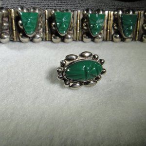 This is a 7" vintage Mexican bracelet crafted in the 1940's or 1950's. It's marked .925 silver with eight green onyx head tribal faces. The set includes earrings, also marked, measuring about 1" long and 3/4" wide with screw backs. The bracelet has the stamping of the silversmith artist as well, Diaz Santoyo. Weight of the pieces is about 60 grams. There are hinges between the squares, each functioning beautifully. The set was originally purchased and worn by my Grandmother in her travels. It is in excellent condition with no flaws noted.