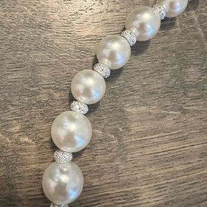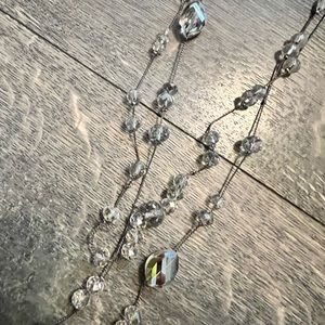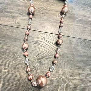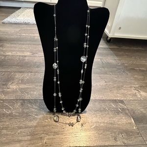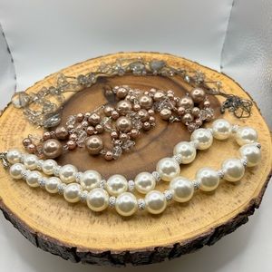 Set of 3 Necklaces. First one is a 2 layer with smoky colored beads. Length is 17” with a 2” extender. Chain is a black color to excenuate the smoky beads. This necklace catches the light beautifully. The second one 23” long and has gold and clear colored beads. Between each is Silver Tone chain. Stunning piece. Last one is large faux pearls and set between is circles of faux crystals. It measures 9” in length with a 3” extender. Definitely a statement piece.