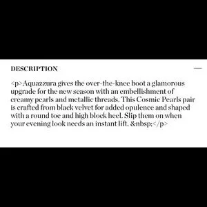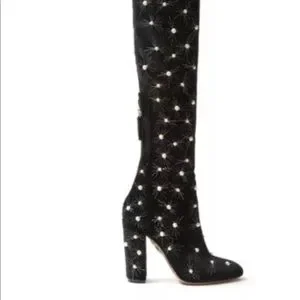 Aquazzura gives the over-the-knee boot a glamorous upgrade for the new season with an embellishment of creamy pearls and metallic threads. This Cosmic Pearls pair is crafted from black velvet for added opulence and shaped with a round toe and high block heel. Slip them on when your evening look needs an instant lift.
