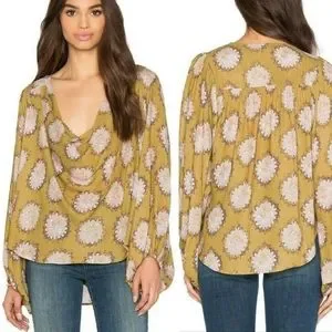 cowling around long sleeve top with low drape cowl neck line on front and flowy wide sleeves with elasticized wrist cuffs