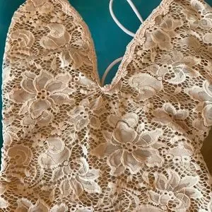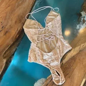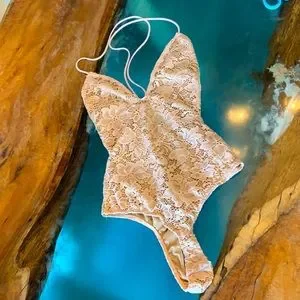 NWT Gorgeous Lace Bodysuit with spaghetti straps that Cris-Cross in the back. Floral detail on lace pattern. 2 snaps at bottom for easy in access. Nice stretch in fabric makes this comfortable. Color is a pinkish-tan that will go with everything.