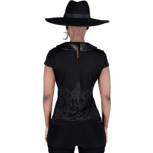 The ultimate piece for grab-n-go goth style - 'Althea' top; conjured using a super-soft stretch fabric which stretches to perfection for a comfortable fit. The devil is in the details - finished with a cute but creepy faux leather collar, print details and cap sleeves.