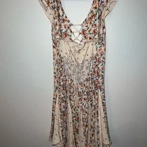 Light and lovely, this swingy printed mini features a lace-up back crowning an eye-catching cutout.