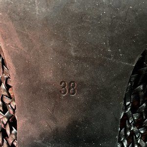 Good preowned condition. Woven leather upper with man made sole. Slip-on styling. Heel measures approx 2"