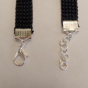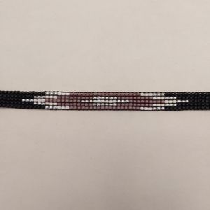 Bracelet is hand beaded using a loom. Made with black, purple and silver Czech glass beads, and silver tone ends with a lobster clasp closer.