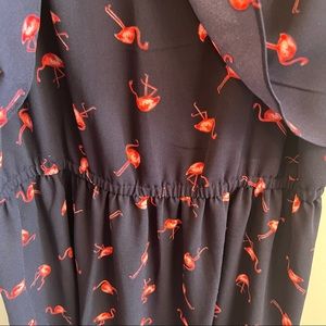 Elle ladies navy with pink flamingo with adjustable spaghetti straps. Elastic at waist makes it super flattering. Light and airy for a hot summer day, super cute for running errands or a summer date night.