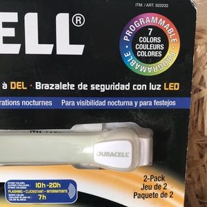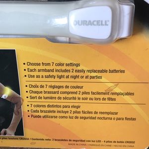 Duracell durabeam ultra safety armband with LED light. This set of two led adjustable armbands are perfect for the outdoors. Adjustable band fits snuggly on arms or legs. They are lightweight and comfortable with 2 light modes and programmable. Seven colors to choose from with the option of high visibility blinking and steady light. Instruction manual included. Great for any member of the family