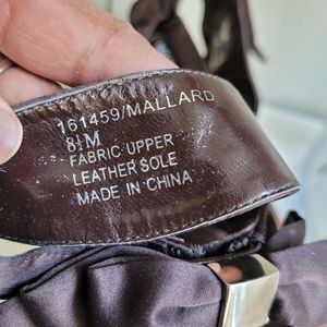 worn once, great condition, material upper, leather sole. This is a beautiful pair of heels. It zips in the back and has a bow with a snap closure.