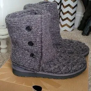 Women's Lattice Cardy sweater boots in charcoal gray. Cuff can be worn straight, bunched around the ankle or folded over. Size 7 but fits an 8, as well, since the sweater material is stretchy. WORN ONCE!