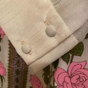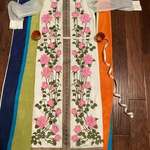 Beautiful Vintage (70-80’s) Alfred Shaheen maxi dress. Size 10. Long sheer sleeves. Excellent condition. Appr. 57” length with 19.5” slit on both sides. Hook and eye closure at neck with 22” zipper. Pit to pit 19”. Has darts. Slight discoloration around inside neck but not visible when worn.