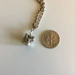 Chain necklace with a crown pendant. The crown is hollow, but thick. The crown has textured details. Seems to be around 17-18 inches long.