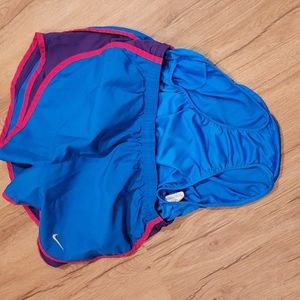 Built-in panty on these Dri-Fit running shorts in purple, fuschia, and teal with grey swoosh. Functional drawstring and elastic waist.