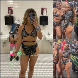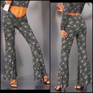 Metallic Spider Web Festival Rave Matching Bikini Arm Bolero Flare Pants Set
