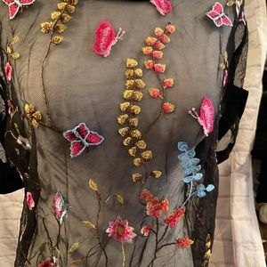 Perfect for Spring is this black sheer netting top with multi coloured floral, butterflies and leaves embroidery.