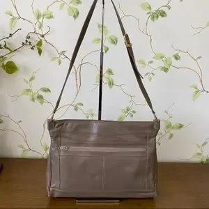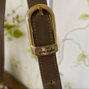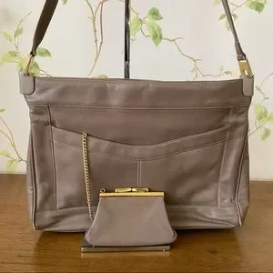 Beautiful Vintage Lou Taylor Handbag Purse in Mushroom Color. Attached Coin Purse, Mirror. Adjustable Strap. Slight wear on bottom corners consistent with Vintage Age. 10”x12”.