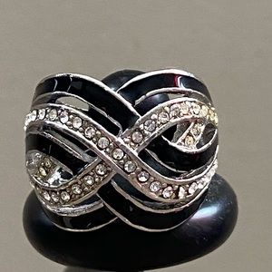 Vintage Rhodium plated black enamel & clear rhinestones infinity 8 shaped, cocktail statement women ring. Size 7.5 Very good Used.