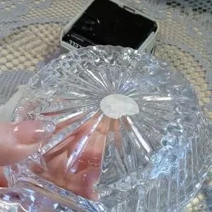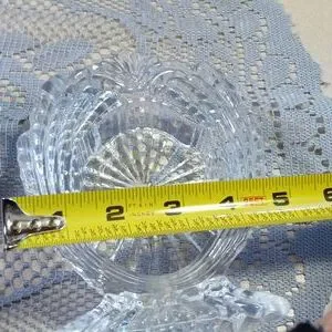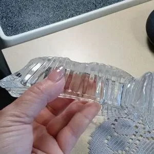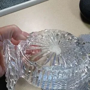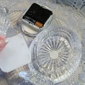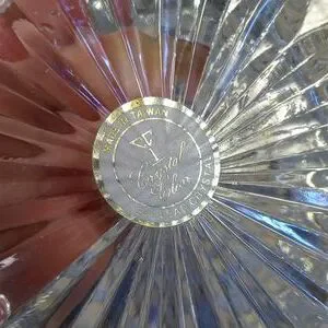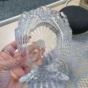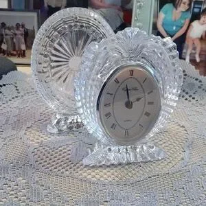 Heavy "Crystal Clear" brand lead crystal two piece interchangeable lead crystal frames, AA battery run (battery included), clock set. Works great. Chip out of back of one frame (shown in photo #5); it has been coated with clear polish to prevent sharp edges.