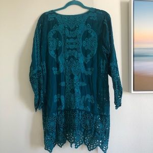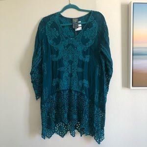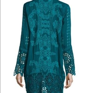 Beautiful Johnny Was Collection "Lona" tunic! Stunning embroidery covers this to in a vibrant teal/turquoise hue! Johnny Was Collection "Lona" tunic in embroidered georgette with eyelet detail.