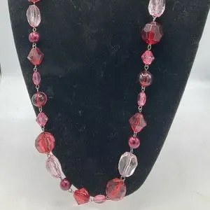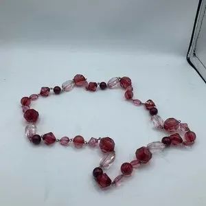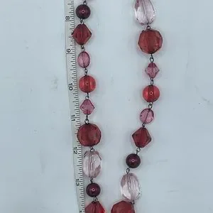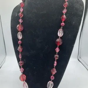 Lovely piece of costume jewelry is this long burgundy and pink plastic faceted beaded necklace.
