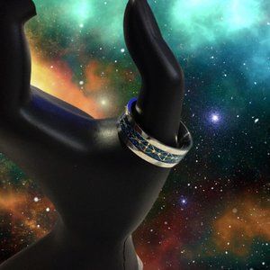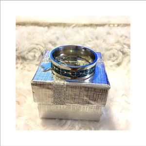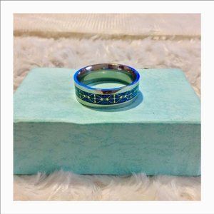 Stainless Steel. Gold hieroglyphic symbols. Turquoise glitter embedded. Beautiful ring. Men’s ring but can be worn unisex. 1.6 cm wide. Size 14