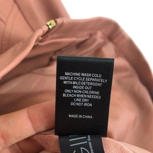 Women's dusty pink faux leather full zip long sleeve jacket. Long sleeves with zipper cuffs, high neckline, full zip front closure. Zippered hand pockets, ribbed panels, lined.