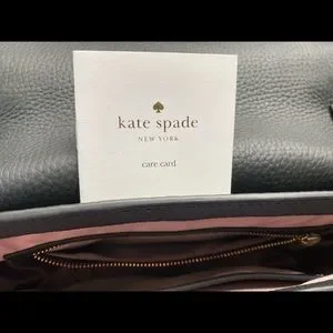 There is a pocket on the back of the bag, a lined zipper pocket on the inside and a pouch. The lining is a pale pink, and the lock is gold plated.
