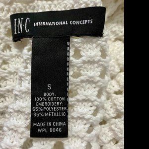 INC cardigan with silver thread embellished design. Has pretty crochet detail, and knitted covered buttons.