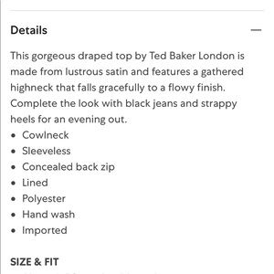Ted Baker Jadis High Neck bias cut top. Size 6. Crafted from drape satin with a figure-skimming bias cut, it’s long line fit makes it great both tucked into trousers or a skirt, or worn over the top. NWT.