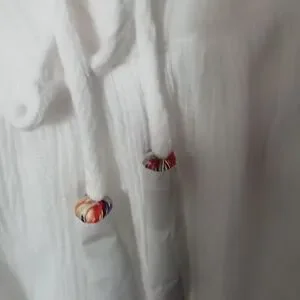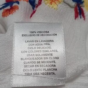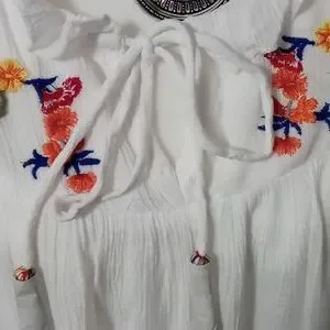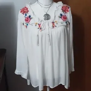 Woman's Top by Hannah. Embroidered flowers on the front side of the top. Has two draw string with tassels that match the flowers.