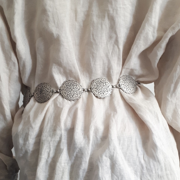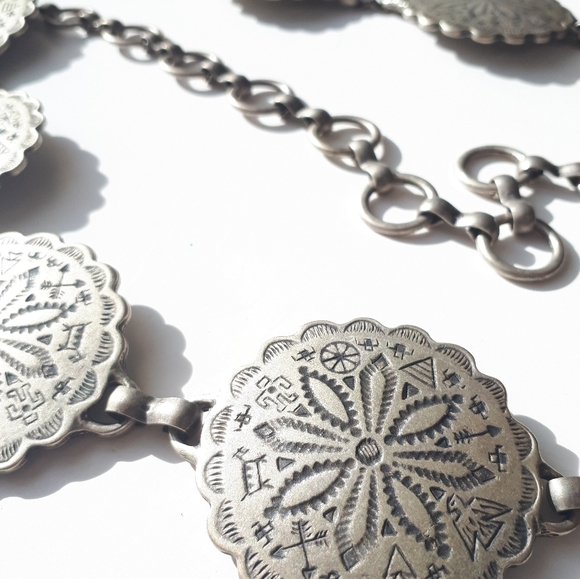 Round and scalloped silver-tone engraved conchos. Medallion discs and metal rings linked together to form this gorgeous piece. Belt is adjustable with hook. Nice weight to the belt.