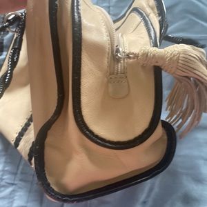 Pre loved tan /crème , with black braided handles & fringe tassels on zippers, bag as is, may have a few spots light pen or scrape but a good deal