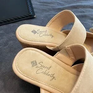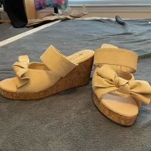 These sandals feature 3.5” wedge heal with cork material. Man made leather in a cream color.