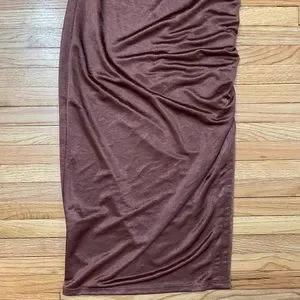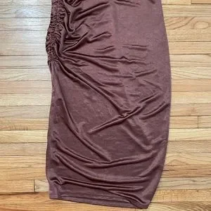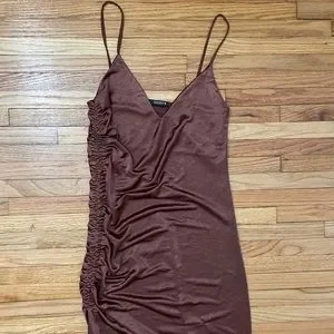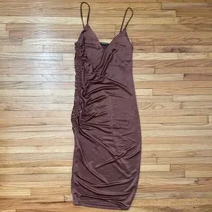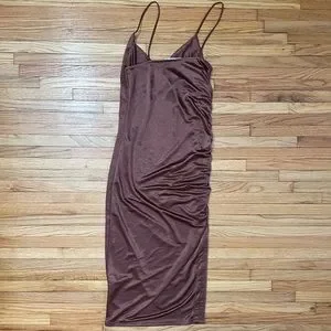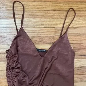 ZARA Brown Slip Dress. Size Small. Midi length. Ruched down one side. Some wear throughout, overall good condition. Satin vibes!