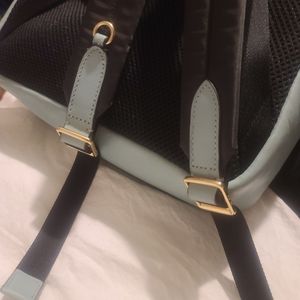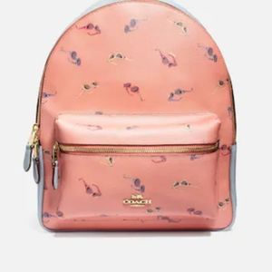 Absolutely adorable coral & teal colored Coach backpack (purse sized)... Sunglass design on the front coral area while the rest of the bag is a solid teal. This bag is embellished with gold zipper & pull hardware. Could be used by an adult lady or a teenaged girl.