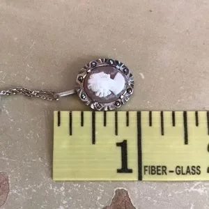Vintage sterling silver marcasite cameo pendant necklace. Approximately 9” long, cameo is 3/4” both chain and pendant marked silver. Very pretty!