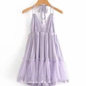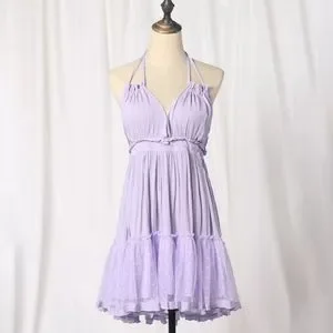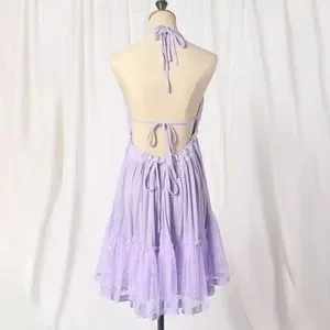 Lilac Layered Mesh Skirt Backless Halter Boho Beach Mini Dress