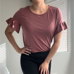 Ruffle Sleeve Solid Tee (Color : Redwood)