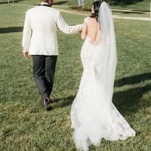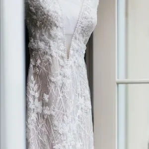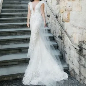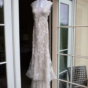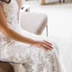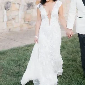 Bought a Berta wedding dress from her 2019 spring trunk show at the premier bridal shop in DC. It is absolutely stunning and I've never seen people in it. The beadwork is impeccable. Color is more ivory. Has a nude under layer then a sparkly layer then the beaded layer. Low neck front and open back. Long train which could not be bustled due to beading and weight. Added two wrist straps that worked nicely. Bought a very simple veil to go with it. Has been professionally dry cleaned. COVID happened and didn't wear it until September 2020. Paid over $10k with alterations. Bertas aren't cheap. Get it here for a steal! It's a sample size.