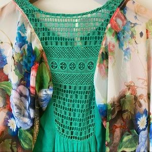 Ellemairco women’s bespoke bohemian flowy mixed media high low hem green and soft floral crochet back blouse size Medium Mixed Floral Printed Long Sleeve Round Neck Top
