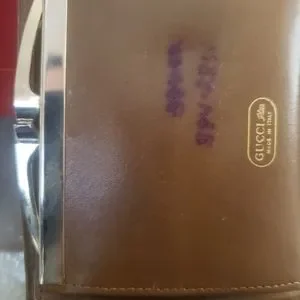 ok this is a vintage wallet GUCCI from 80's has small Ink marks on front u can see on pic an inside has blue Ink kind of a numbers an a crack corners clear plastic where u place the driver's license